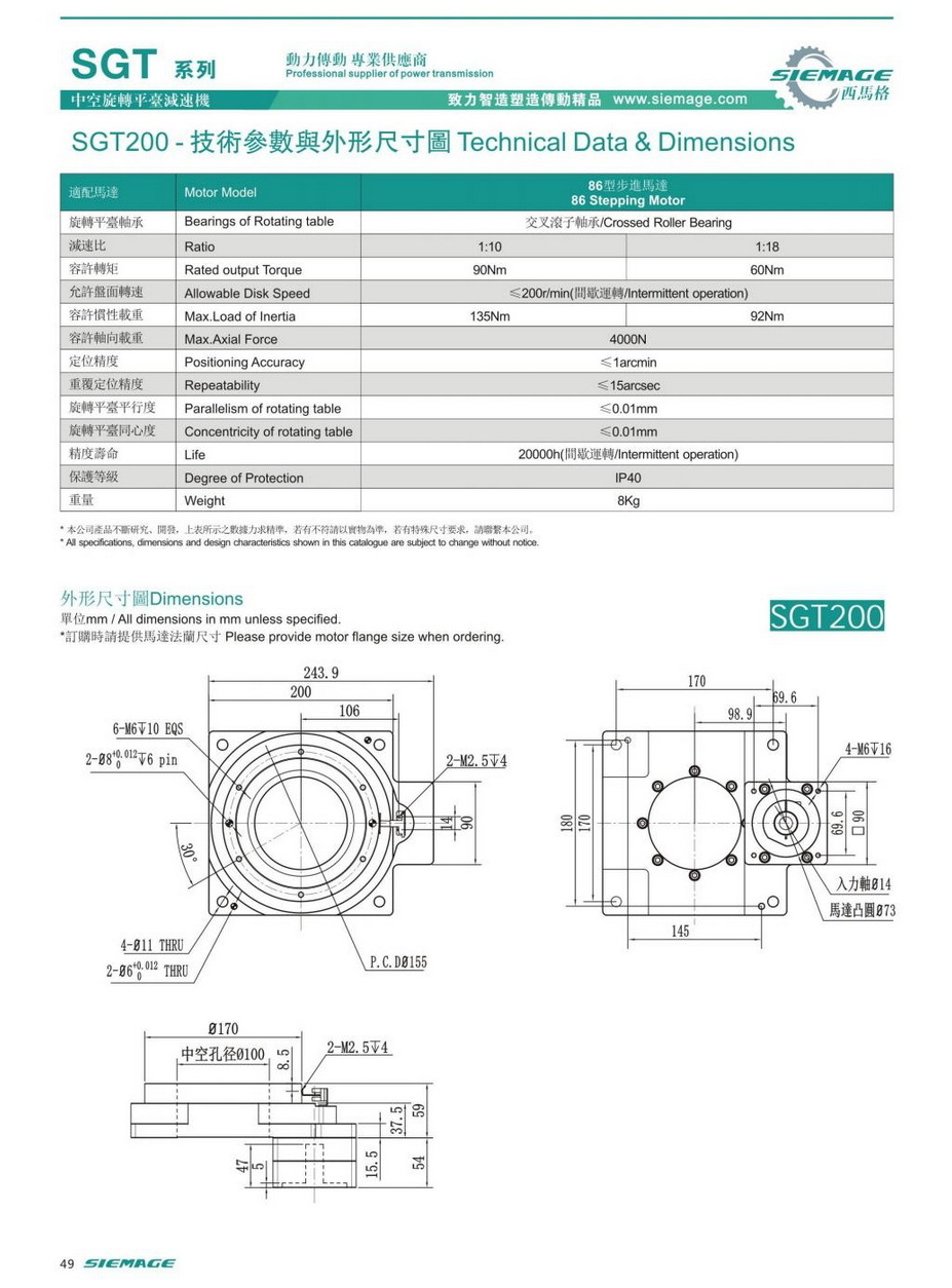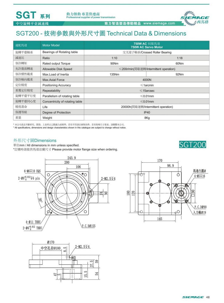 中空旋轉平臺減速機SGT200,siemage中空平臺可配各品牌750W伺服電機,伺服馬達,各廠家86型步進馬達,86步進電機。減速比有1:10,1:18等。
