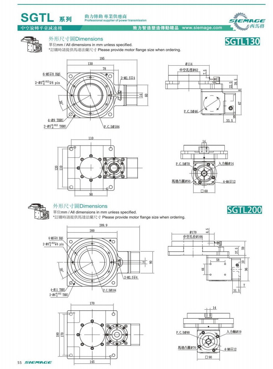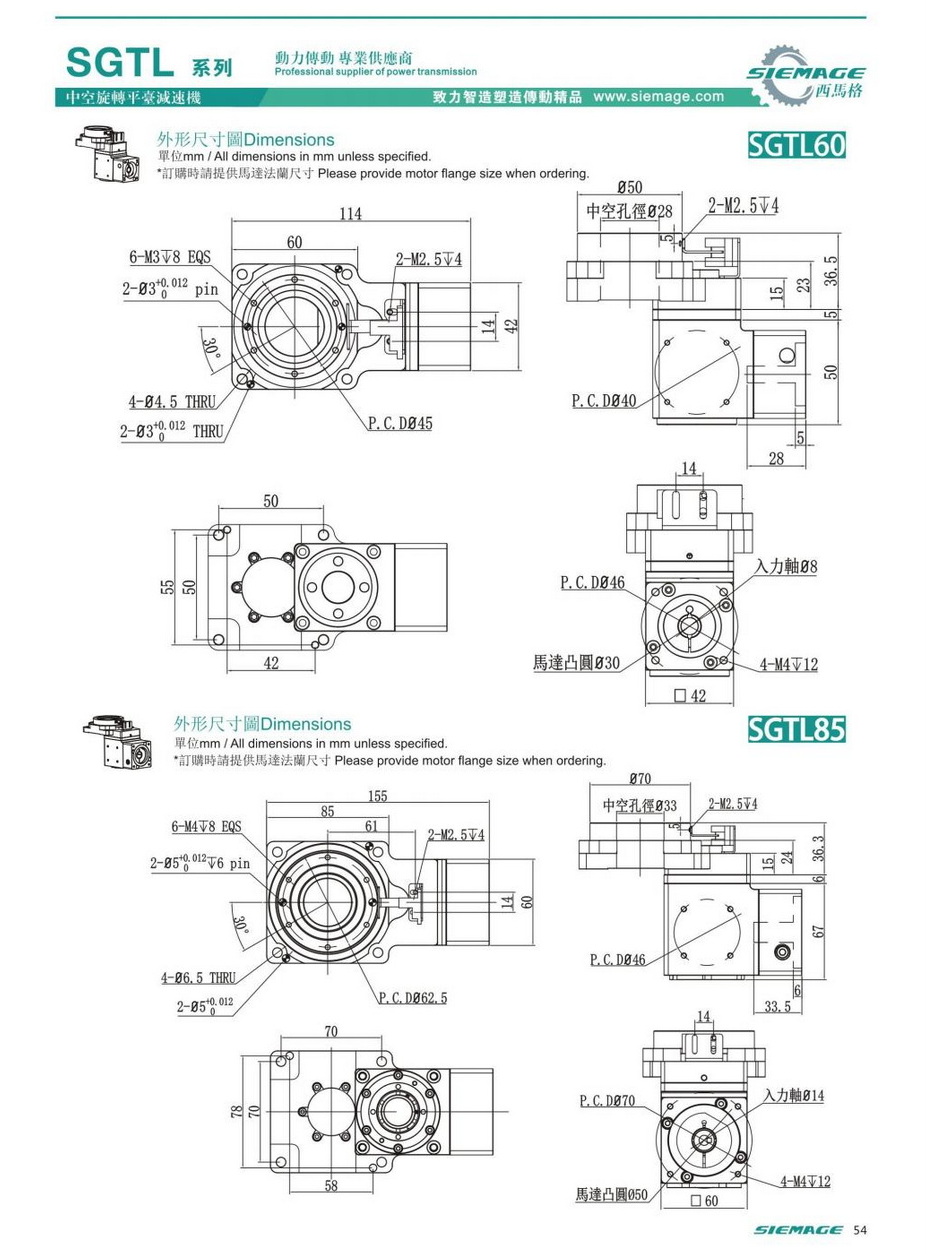 西馬格直角中空旋轉(zhuǎn)平臺(tái)型號(hào)SGTL60,SGTL85,SGTL130,SGTL200.可配各品牌伺服電機(jī),伺服馬達(dá),各廠家步進(jìn)馬達(dá),步進(jìn)電機(jī)。減速比有多種選擇。